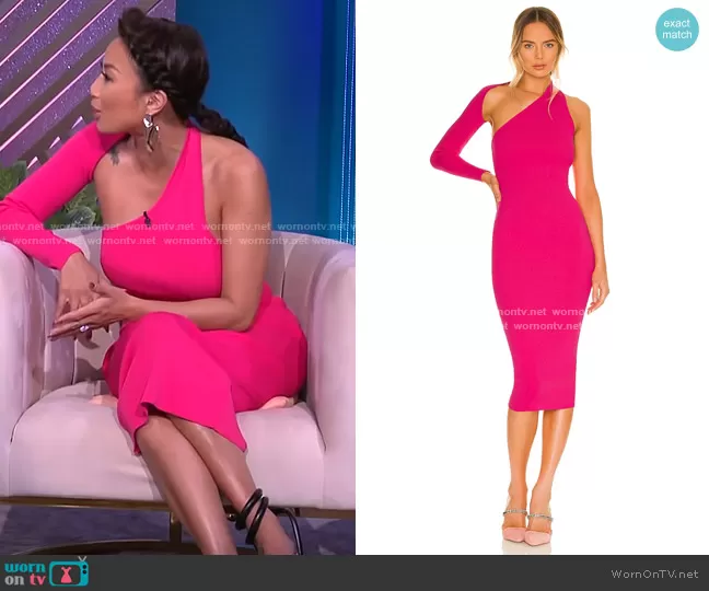 Jeannie Mai on The Real on BETher was spotted wearing this pink cutout one sleeve dress on The Real on Apr 25 2022's episode. Jeannie's Dress is the Kaiya Midi Dress jby NBD.