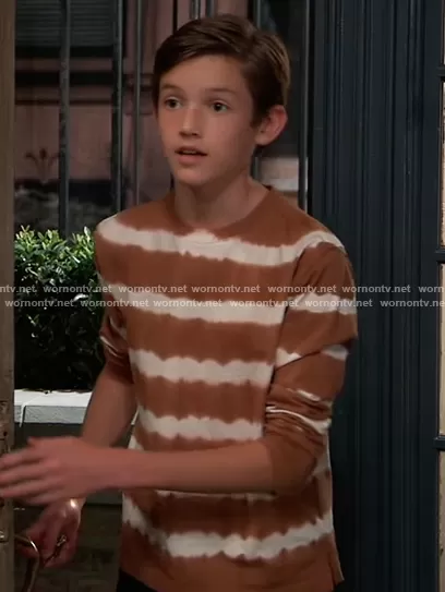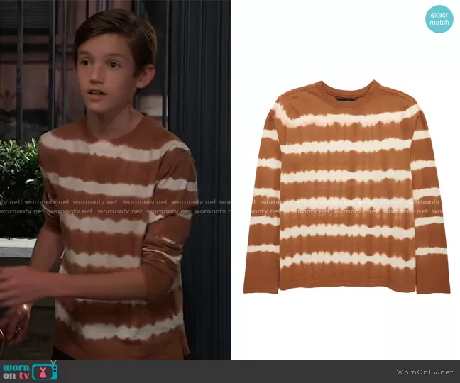 (played by ) on General Hospital on ABC was spotted wearing this brown tie dye tee on General Hospital on Apr 27 2022's episode. 's Shirt is the Slouchy Long Sleeve T-Shirt by Treasure & Bond.