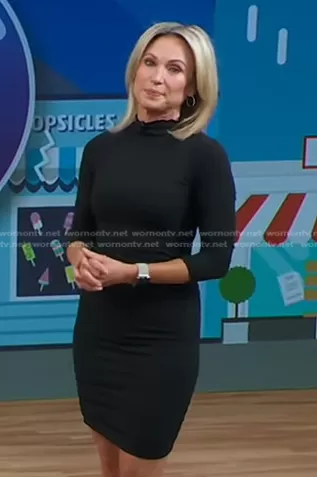 Amy Robach on Good Morning America on ABC was spotted wearing this black ribbed mock neck dress on Good Morning America on Apr 26 2022's episode. Amy's Dress is the Sexy Fitted Long Sleeve Midi Dress by Velvet Torch.