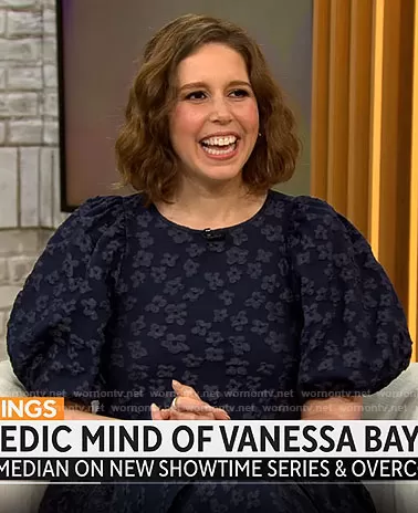 on CBS Mornings on CBS was spotted wearing this navy floral puff sleeve top and pants set on CBS Mornings on Apr 26 2022's episode. 's Top is the Liw Top by Stine Goya . 's Pants is the Isra Top by Stine Goya.