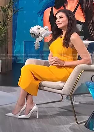 on E! News on E! was spotted wearing this orange ribbed dress on E! News Daily Pop on Apr 27 2022's episode. 's Dress is the Lace-Insert Rib-Knitted Midi Dress by Self Portrait.