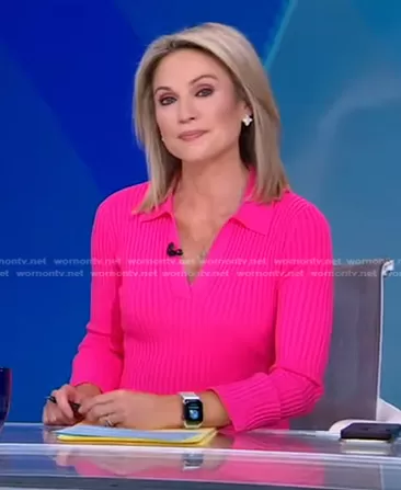 Amy Robach on Good Morning America on ABC was spotted wearing this pink ribbed polo dress on Good Morning America on May 02 2022's episode. Amy's Dress is the Rib-Knit Minidress by Helmut Lang.