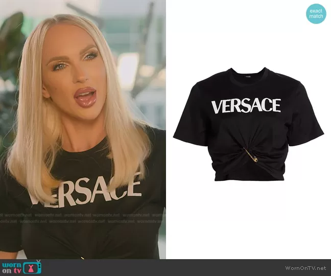 Christine Quinn on Selling Sunset on Netflix was spotted wearing this black Versace tee on Selling Sunset on episode 'Step Up or Step Out' (5x06) in Apr 2022. Christine's Top is the Safety Pin Logo T-Shirt by Versace.