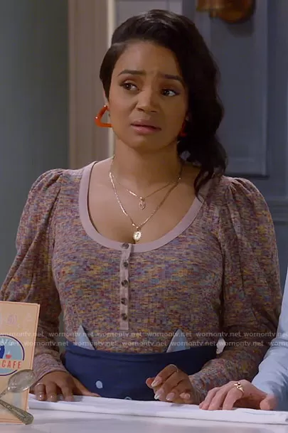 Randi (played by Kyla Pratt) on Call Me Kat on Fox was spotted wearing this puff sleeve knit henley top on Call Me Kat on episode 'Call Me Flatch' (2x17) in Apr 2022. Randi's Top is the Puff-Sleeved Knit Henley Top by Anthropologie.