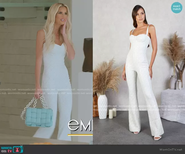 Emma Hernan on Selling Sunset on Netflix was spotted wearing this metallic sweetheart jumpsuit on Selling Sunset on episode 'It's Getting Personal' (5x07) in Apr 2022. Emma's Jumpsuit is the Hailey White Jumpsuit by Nadine Merabi . Emma's Bag is the The Chain Cassette Bag by Bottega Veneta.