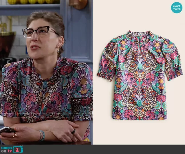 Kat Silver (played by Mayim Bialik) on Call Me Kat on Fox was spotted wearing this floral puff sleeve top on Call Me Kat on episode 'Call Me Prescription Roulette' (3x11) in Jan 2023. Kat's Top is the Puff-sleeve top in Liberty Elm House floral by J. Crew.