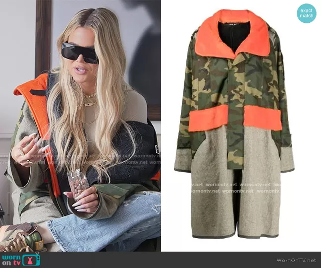 Khloe Kardashian (played by Khloe Kardashian) on The Kardashians on Hulu was spotted wearing this camo jacket and sunglasses on The Kardashians on episode 'Live From New York' (1x03) in Apr 2022. Khloe's Coat is the Camouflage Panelled Coat by Junya Watanabe . Khloe's Shoes is the X Concepts SB Dunk High Sneakers by Nike . Khloe's Sunglasses is the Documenta 60MM Square Sunglasses by Rick Owens.