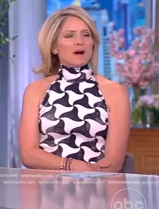 Sara Haines on The View on ABC was spotted wearing this printed halter neck top on The View on Apr 29 2022's episode. Sara's Top is the Printed Rib-Knit Halter Top by Bottega Veneta.