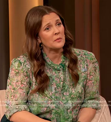 Drew Barrymore on The Drew Barrymore Show on CBS was spotted wearing this green floral print blouse on The Drew Barrymore Show on Apr 29 2022's episode. Drew's Top is the Floral Silk Georgette Blouse by Giambattista Valli . Drew's Pants is the Vesta high-rise flared pants by Gabriela Hearst . Drew's Shoes is the Bianca 110mm platform sandals by Saint Laurent.
