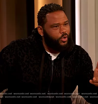 on The Drew Barrymore Show on CBS was spotted wearing this black leopard print hoodie on The Drew Barrymore Show on Apr 29 2022's episode. 's Sweater is the Leopard-Print Flocked Zip Hoodie by Dolce & Gabbana.