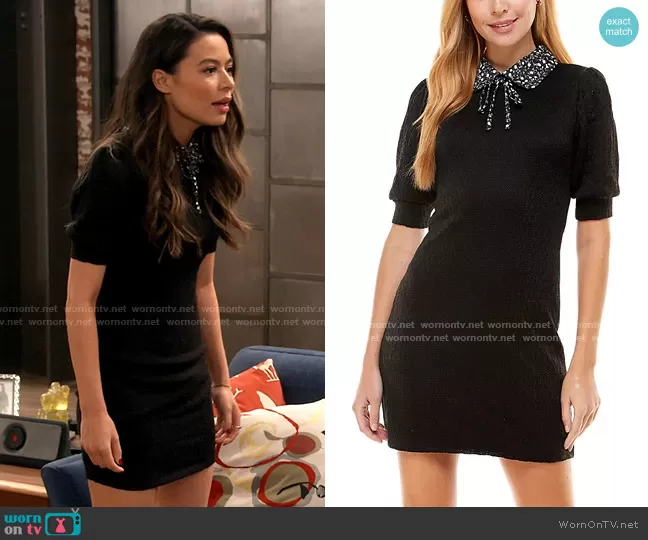 Carly Shay (played by Miranda Cosgrove) on iCarly on Paramount+ was spotted wearing this black mini dress with floral collar on iCarly on episode 'iCupid' (2x05) in Apr 2022. Carly's Dress is the Printed-Collar Cable-Knit Sweater Dress by Kingston Grey.