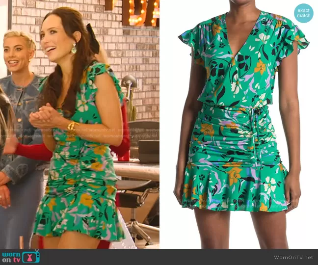 Davina Potratz on Selling Sunset on Netflix was spotted wearing this green floral ruched mini dress on Selling Sunset on episode 'She's Your Problem Too' (5x08) in Apr 2022. Davina's Dress is the Marla Floral Ruched Mini Dress In Multi by Veronica Beard.