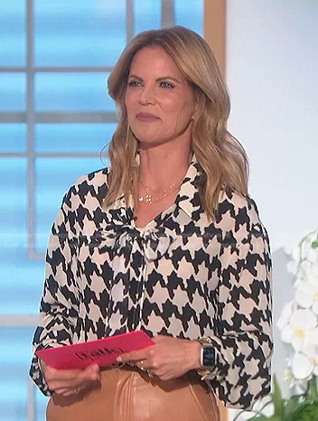 Natalie Morales on The Talk on CBS was spotted wearing this houndstooth tie neck blouse on The Talk on May 02 2022's episode. Natalie's Top is the Leuca Hounds-Tooth Shirt by Luisa Spagnoli . Natalie's Belt is the Leather Belt with Double G Buckle by Gucci.