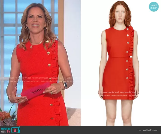 Natalie Morales on The Talk on CBS was spotted wearing this red sleeveless ruffle mini dress on The Talk on Apr 27 2022's episode. Natalie's Dress is the Red Ruffle Dress by MSGM.