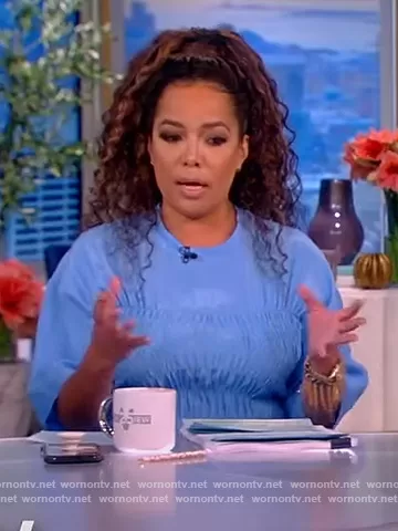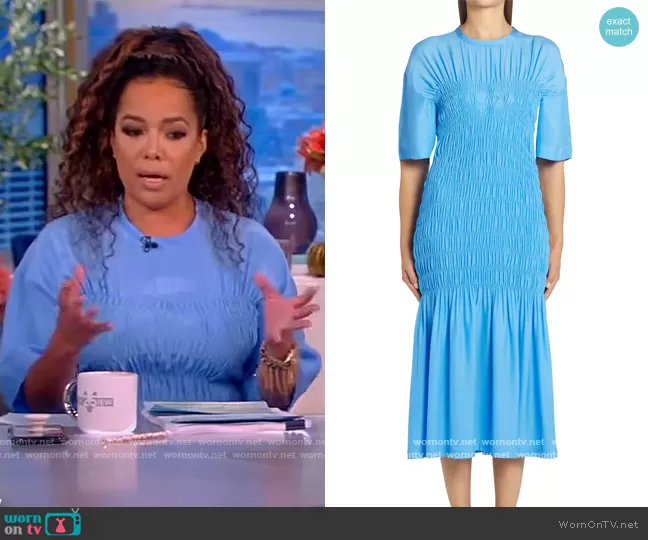 Sunny Hostin on The View on ABC was spotted wearing this blue smocked front dress on The View on May 03 2022's episode. Sunny's Dress is the Smocked Silk Midi Dress by Stella McCartney.