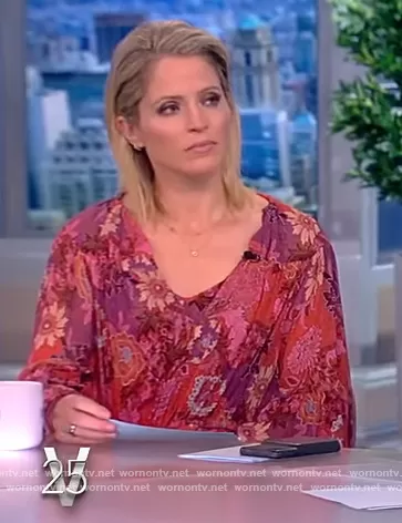 Sara Haines on The View on ABC was spotted wearing this red floral print mini dress on The View on May 03 2022's episode. Sara's Dress is the Elise Long Sleeve Silk Minidress by A.L.C..