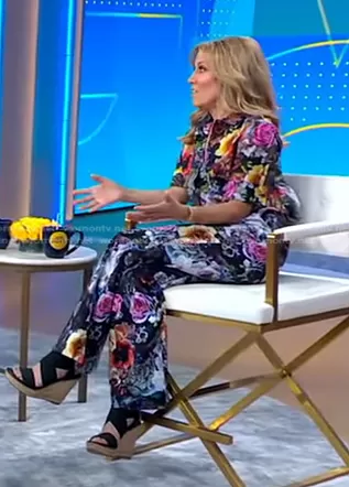on Good Morning America on ABC was spotted wearing this black floral shirt and pants on Good Morning America on May 03 2022's episode. 's Top is the Floral Print Voile Trapeze Shirt by Adam Lippes . 's Pants is the Floral-Print Straight-Leg Cropped Pants by Adam Lippes.