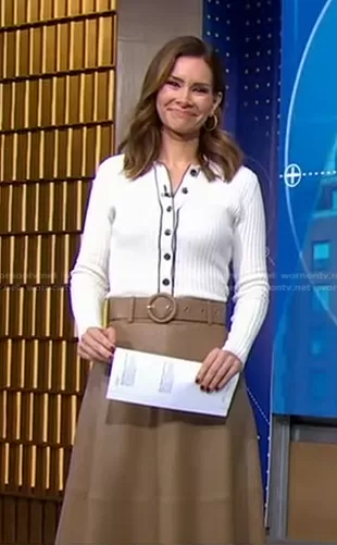 Rebecca Jarvis on Good Morning America on ABC was spotted wearing this white ribbed cardigan on Good Morning America on Jan 19 2023's episode. Rebecca's Top is the Ashlen Cotton-Knit Top by Anna Quan . Rebecca's Skirt is the Cape Skirt with Belt by Zara.