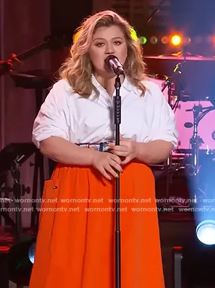 Kelly Clarkson on The Kelly Clarkson Show on NBC was spotted wearing this orange skirt and embroidered belt on The Kelly Clarkson Show on May 04 2022's episode. Kelly's Skirt is the Anja Midi Skirt by Sir. . Kelly's Belt is the Embroidered Leather Buckle Belt by Etro.