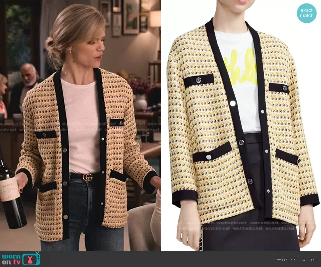 Mallory (played by Brooklyn Decker) on Grace and Frankie on Netflix was spotted wearing this yellow tweed cardigan on Grace and Frankie on episode 'The Raccoon' (7x05) in May 2022. Mallory's Jacket is the Visidore Tweed Jacket by Maje . Mallory's Belt is the Thin Leather GG-Buckle Belt by Gucci.