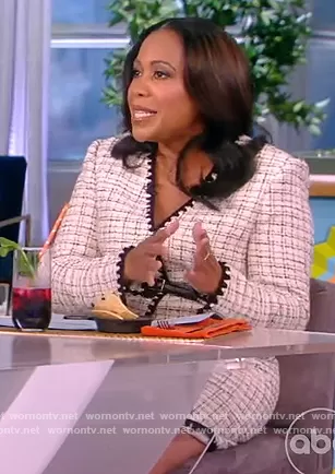 on The View on ABC was spotted wearing this white tweed button front dress on The View on May 05 2022's episode. 's Dress is the Palatine Tweed Dress by Veronica Beard.