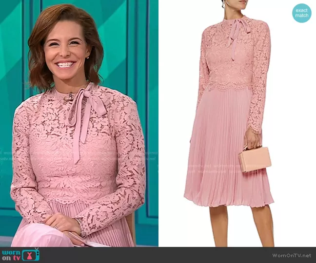 on Today on NBC was spotted wearing this Stephanie Ruhle’s pink lace pleated dress on Today on May 05 2022's episode. 's Dress is the Short Dress by Mikael Aghal.