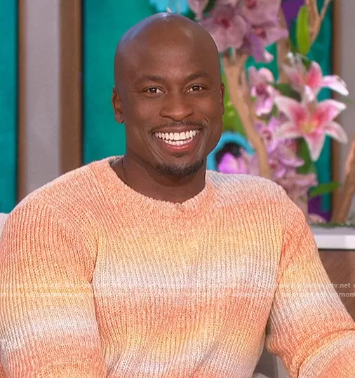 Akbar Gbajabiamila on The Talk on CBS was spotted wearing this orange ombre knit sweater on The Talk on May 05 2022's episode. Akbar's Sweater is the Ombré Stripe Crewneck Sweater by Scotch and Soda.