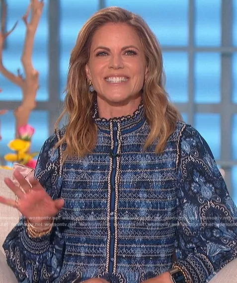 Natalie Morales on The Talk on CBS was spotted wearing this blue floral embroidered dress on The Talk on May 05 2022's episode. Natalie's Dress is the Elvira silk dress by Alice + Olivia.