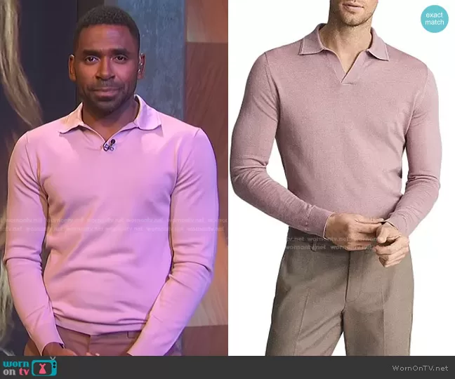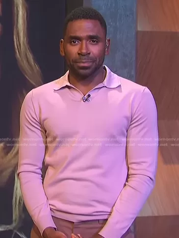 Justin Sylvester on E! News on E! was spotted wearing this pink long sleeve polo shirt on E! News Daily Pop on May 05 2022's episode. Justin's Shirt is the Milburn Open Collar Long Sleeve Wool Polo by Reiss.
