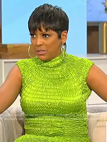 Tamron Hall on Tamron Hall Show on ABC was spotted wearing this green smocked midi dress on Tamron Hall Show on May 05 2022's episode. Tamron's Dress is the Smocked Satin Midi Dress by Dries Van Noten.