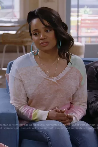 Randi (played by Kyla Pratt) on Call Me Kat on Fox was spotted wearing this colorblock v-neck sweater on Call Me Kat on episode 'Call Me Shellfish' (2x18) in May 2022. Randi's Sweater is the Mosaic Sunrise Sweater by Nic + Zoe.