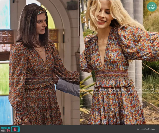 (played by ) on Grace and Frankie on Netflix was spotted wearing this floral print ruffled dress on Grace and Frankie on episode 'The Horrible Family' (7x11) in May 2022. 's Dress is the Catania Dress in Wildflower by Doen.