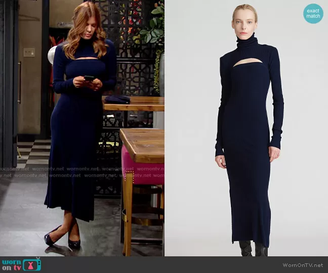 Phyllis Summers (played by Michelle Stafford) on The Young and the Restless on CBS was spotted wearing this long navy dress with cutout on The Young and the Restless on Nov 09 2021's episode. Phyllis's Dress is the Laney Sweater Dress by Halston.