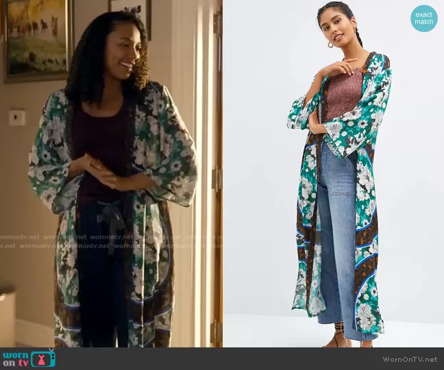 Cassie Dewell (played by Kylie Bunbury) on Big Sky on ABC was spotted wearing this green floral robe on Big Sky on episode 'Keys to the Kingdom' (2x16) in May 2022. Cassie's Robe is the Floral Cover-Up Kimono by bl-nk at Anthropologie.