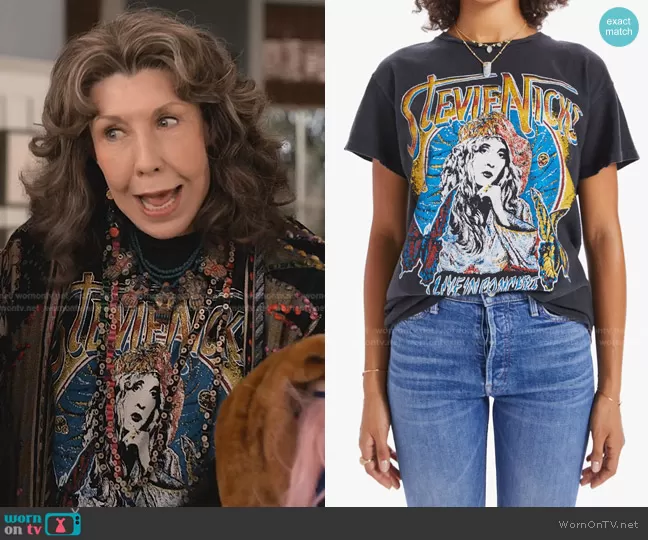 Frankie (played by Lily Tomlin) on Grace and Frankie on Netflix was spotted wearing this graphic print tee on Grace and Frankie on episode 'The Casino' (7x12) in May 2022. Frankie's Top is the Stevie Nicks Tee by Madeworn . Frankie's Earrings is the Recycled Nespresso Coffee Capsules Earrings by Kathleen Nowak Tucci.