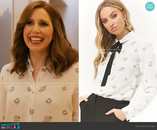 Joanna Gold (played by Vanessa Bayer) on I Love That For You on Showtime was spotted wearing this teacup print button down shirt on I Love That For You on episode 'Faux Florals' (1x02) in May 2022. Joanna's Top is the Teacup Print Shirt by Forever 21.