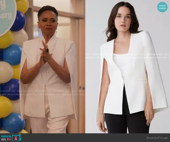 Patricia (played by Jenifer Lewis) on I Love That For You on Showtime was spotted wearing this white cape on I Love That For You on episode 'Faux Florals' (1x02) in May 2022. Patricia's Jacket is the Upas Cape by Bcbgmaxazria.
