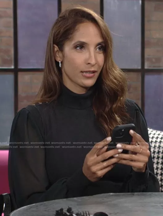 (played by ) on The Young and the Restless on CBS was spotted wearing this black turtleneck sweater with sheer sleeves on The Young and the Restless on May 06 2022's episode. 's Sweater is the Georgette Sleeve Knit Sweater by Karen Millen.