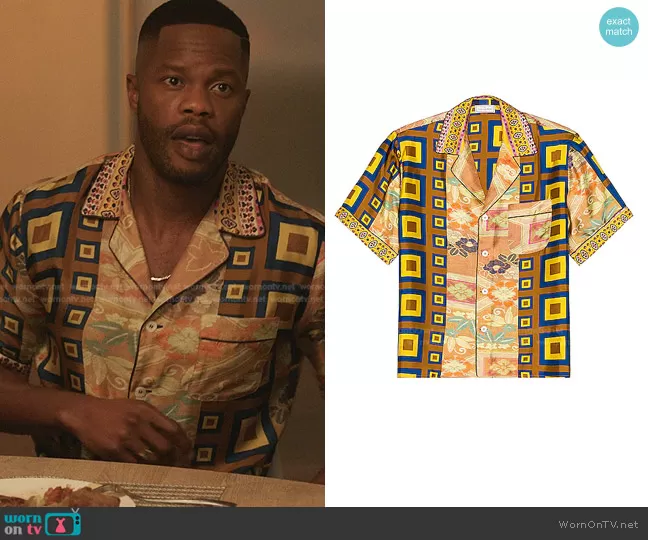 Jeff Colby (played by Sam Adegoke) on Dynasty on The CW was spotted wearing this mixed print short sleeve shirt on Dynasty on episode 'Mind Your Own Business' (5x10) in May 2022. Jeff's Shirt is the Aloe Button Down Shirt by Pierre-Louis Mascia.