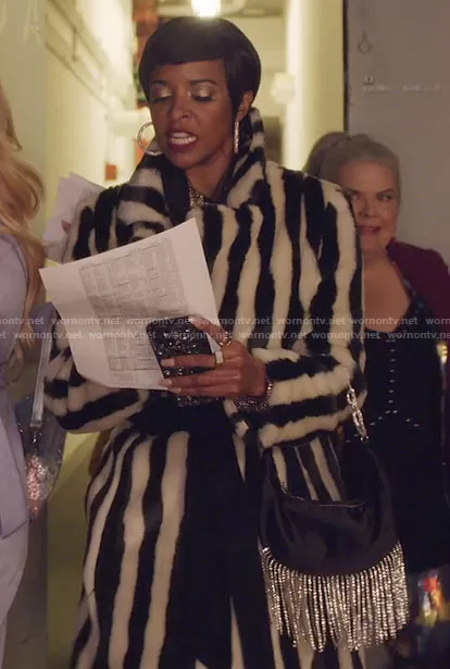 Wickie Roy (played by Renée Elise Goldsberry) on Girls5eva on Peacock was spotted wearing this striped fur coat on Girls5eva on episode 'Who U Know' (2x03) in May 2022. Wickie's Coat is the Bungalow Striped Faux Fur Coat by Staud . Wickie's Bag is the Shiny Satin Shoulder Bag by Zara.