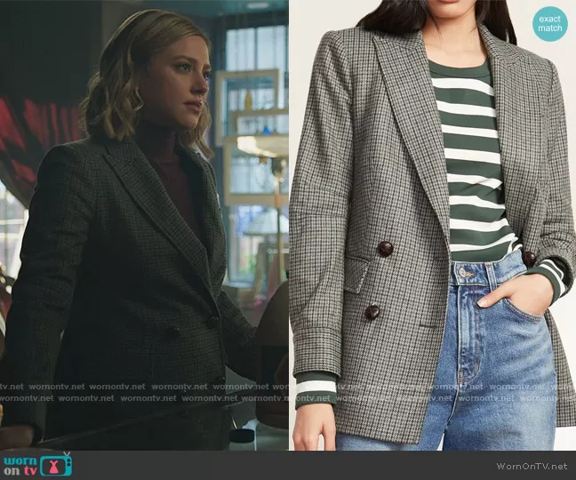 Betty Cooper (played by Lili Reinhart) on Riverdale on The CW was spotted wearing this check blazer on Riverdale on episode 'Ex-Libris' (6x13) in May 2022. Betty's Blazer is the Pyle Houndstooth Dickey Jacket by Veronica Beard.