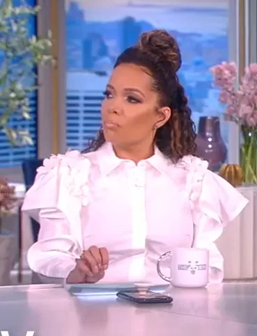 Sunny Hostin on The View on ABC was spotted wearing this white ruffle blouse on The View on May 09 2022's episode. Sunny's Top is the Ruffle & Floral-Embellished Blouse by Carolina Herrera.