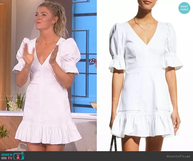 Amanda Kloots on The Talk on CBS was spotted wearing this white v-neck ruffle mini dress on The Talk on May 09 2022's episode. Amanda's Dress is the Natasha Patch-Pocket Dress by Cinq a Sept . Amanda's Shoes is the Mirela Leather Espadrille Wedge Sandals by Stuart Weitzman.