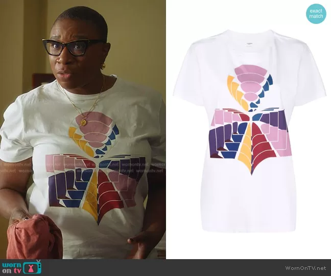 Henrietta Wilson (played by Aisha Hinds) on 9-1-1 on ABC was spotted wearing this white printed tee on 9-1-1 on episode 'Hero Complex' (5x17) in May 2022. Hen's Top is the Patterned Short-Sleeved T-Shirt by Isabel Marant Étoile.