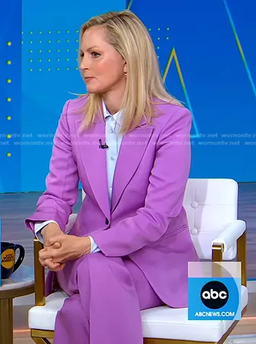 on Good Morning America on ABC was spotted wearing this lilac blazer and pants on Good Morning America on May 10 2022's episode. 's Jacket is the Tailored Single-Breasted Wool Jacket by Victoria Beckham . 's Pants is the Slim Straight Leg Trouser by Victoria Beckham.