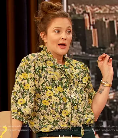 Drew Barrymore on The Drew Barrymore Show on CBS was spotted wearing this floral print blouse on The Drew Barrymore Show on May 10 2022's episode. Drew's Top is the Lavalliere Blouse in Paquerette Crepon by Celine . Drew's Pants is the Vesta Wide-Leg Pants by Gabriela Hearst.