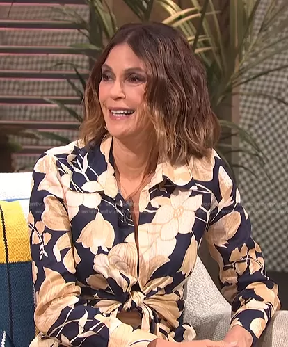 on E! News on E! was spotted wearing this Teri Hatcher’s navy floral tie front blouse and skirt on E! News Daily Pop on May 10 2022's episode. 's Top is the Linen Printed Tie Waist Blouse by Reiss