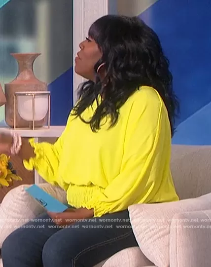 Sheryl Underwood on The Talk on CBS was spotted wearing this yellow smocked waist top on The Talk on May 10 2022's episode. Sheryl's Top is the Smocked-Waist Dolman-Sleeve Top by Vince Camuto.