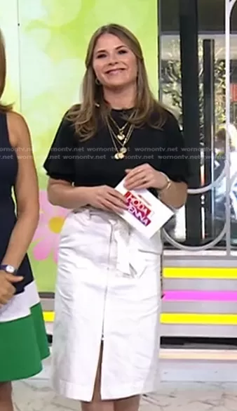 Jenna Bush Hager on Today on NBC was spotted wearing this white zip front skrit on Today on Aug 23 2022's episode. Jenna's Skirt is the Denim Midi Skirt by Thakoon Collective.