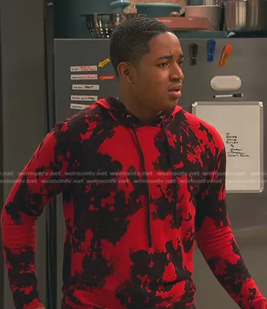 Booker Baxter (played by Issac Ryan Brown) on Ravens Home on Disney was spotted wearing this red tie dye sweater hoodie on Ravens Home on episode 'Retreat Yourself' (5x07) in Apr 2022.